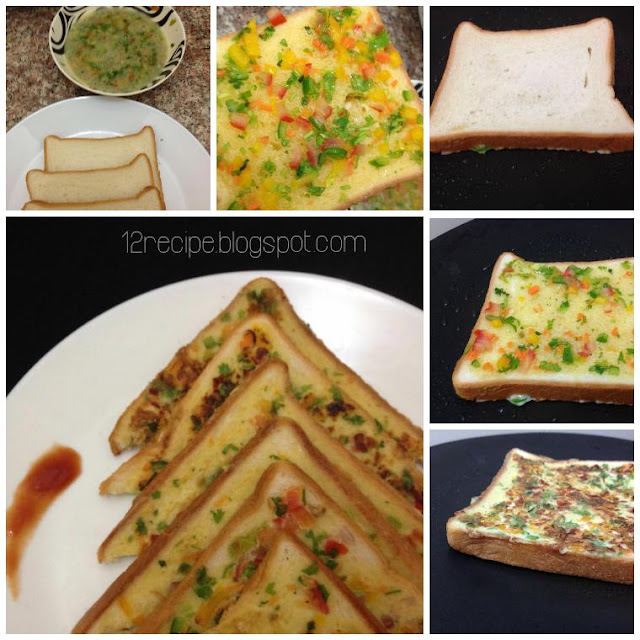 - Heat a pan with little butter (1/2 tbsp) and add the bread slice with egg spread side touches the pan.